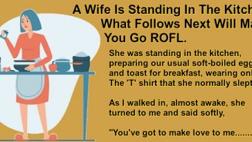 A Wife Is Standing In The Kitchen.